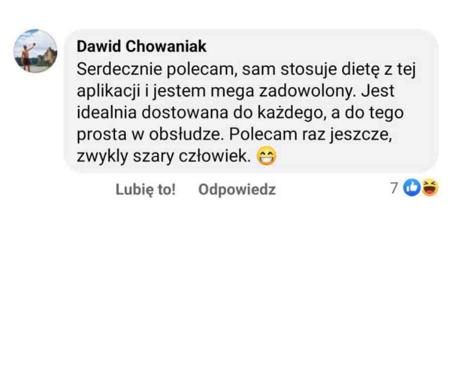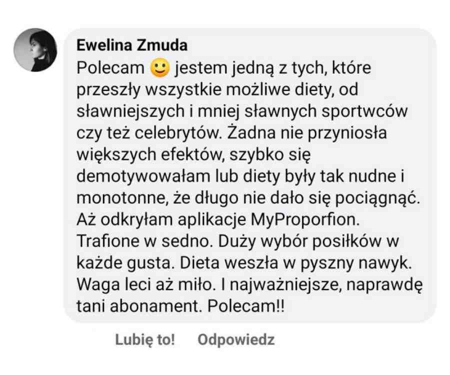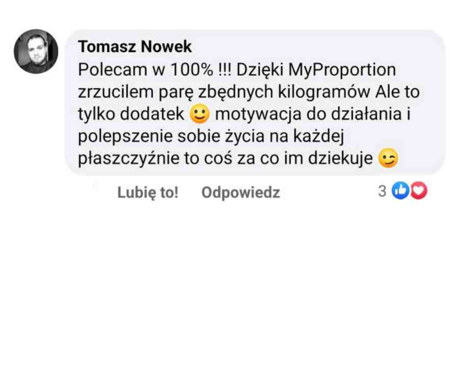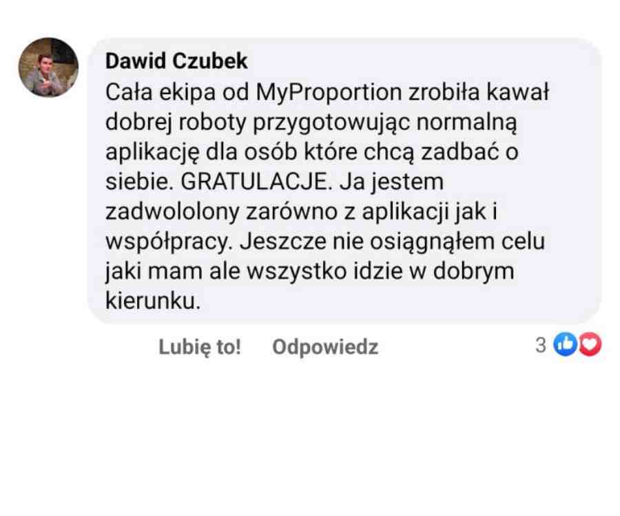 Próbowałem już wielu diet, bardziej lub mniej drastycznych. Aż w końcu trafiłem do TheProportion i jest to najlepsza firma jeśli chodzi o dietetykę i treningi. Aplikacja MyProportion jest świetnym rozwiązaniem, można tam robić dosłownie wszystko a najlepsze jest to, że mogę zamieniać produkty. Teraz jem to co lubię i przy tym waga spada. Polecam.