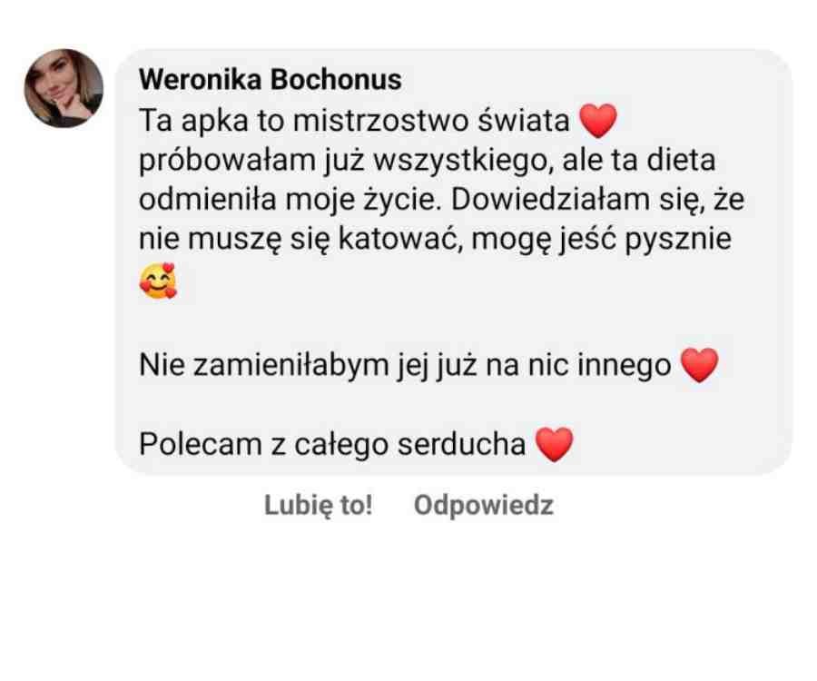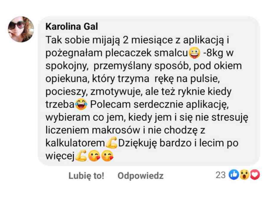 Dzięki aplikacji i tworzeniu przez siebie posiłków i jadłospisów zaczynam myśleć o tym co jem. Korzystając z niej na co dzień uczę się jak jeść zdrowo i smacznie. Jem to na co mam ochotę i chudnę! Szczerze polecam 🙂